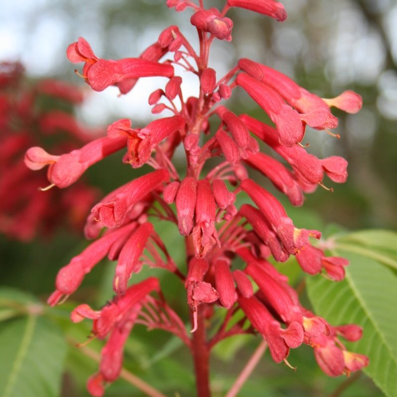 Red buckeye is a small native tree prized for its bold red spring flowers and tidy, rounded form. It is especially valuable in wildlife-friendly landscapes, where its nectar-rich blooms attract hummingbirds and early pollinators. This ornamental species performs best in moist soils and can handle more shade than many flowering trees.